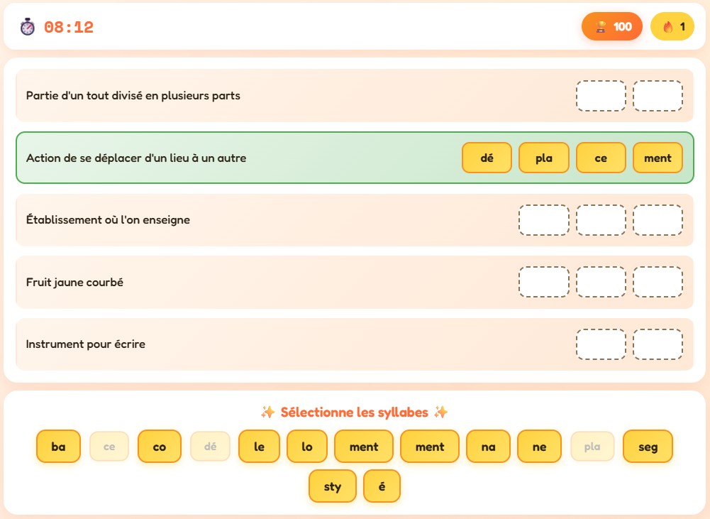 → Le joueur reconstruit le mot en glissant-déposant les bonnes syllabes