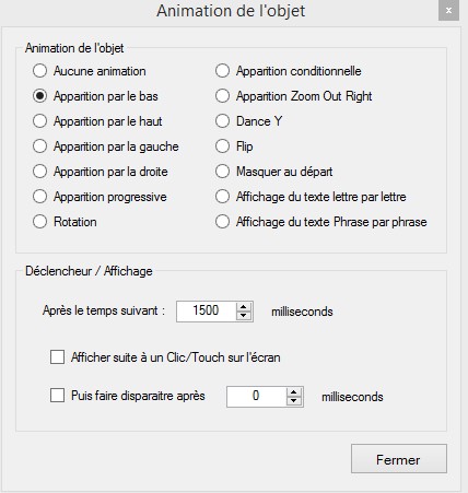 En bas de cette fenêtre est proposé le temps avant déclenchement de l'animation en millisecondes.