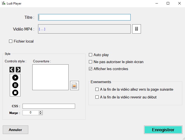 Afficher les contrôles : Affiche ou non les boutons play stop pause et barre de progression