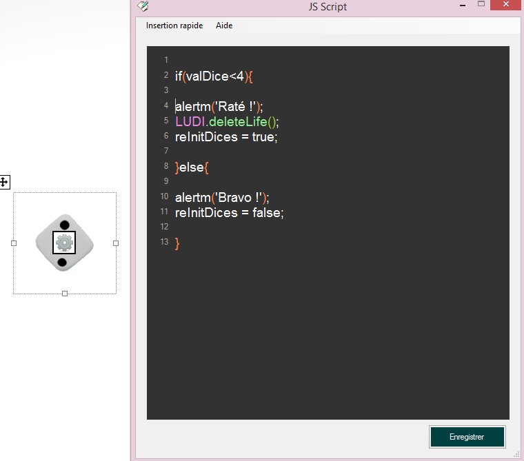 L'objet Dés permet de faire avancer un pion sur l'objet Map Target mais peux également être utilisé seul à l'aide d'un script JS.