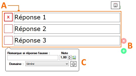 A => Permet de saisir les réponses et les distracteurs et de cocher la (ou les) bonnes réponses