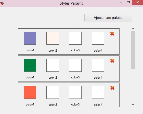 Vous pouvez définir ici des jeux de 4 couleurs qui vont être appliquées à différents objets.