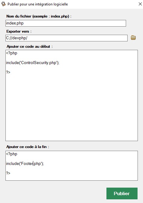 Publier pour une intégration logicielle permet de publier le fichier HTML en changeant l'extension et en y ajoutant des instructions personnalisées.